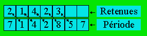 On fait 7 × 5 = 35. Le 5 est la dizaine de la période. Le 3 est une retenue.